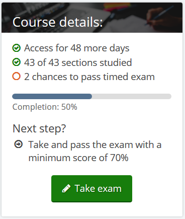 • Once all modules have been marked with a green check-mark as studied, you are ready to take your exam. To begin your exam, click the green Take Exam button.