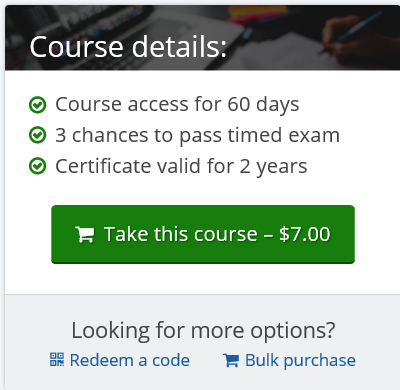 When you purchase your course, you will have 3 opportunities to pass the test. If you fail the test 3 times, you will be required to repurchase the course.
