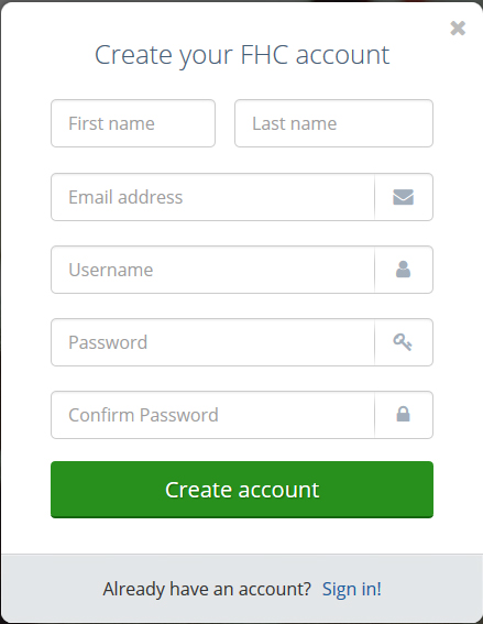 To reset your password, select "Customer support" from the menu at the top of the FHC webpage. You can then click the "Reset your password" link underneath the green "Sign in" button.