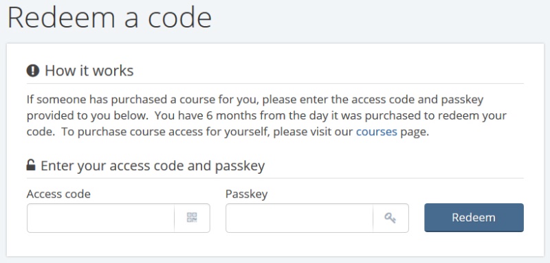 • If you have been given a bulk redemption code then click on the Redeem a Code link below the Take this course button.