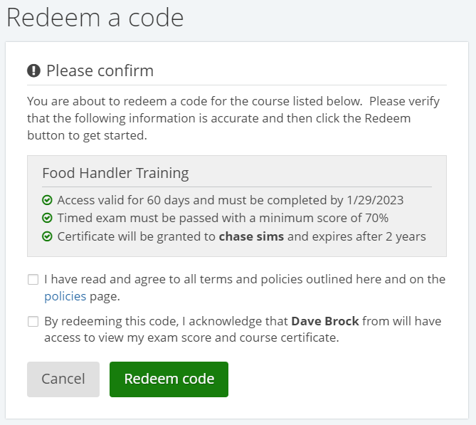 The pass key and access codes are for group purchases only and are used to redeem a food handler training course purchased by your company. If you are part of a group order, you will need to contact your manager to receive your pass key and access code.